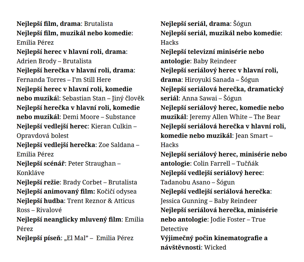 82. ročník Zlatých glóbů, který vysílaly stanice CBS a Paramount+, vyhlásil své vítěze. Film Emilia Pérez, který měl letos nejvíce nominací, získal čtyři ocenění, včetně ceny za nejlepší film - muzikál nebo komedii. Poválečný epos Bradyho Corbeta Brutalista byl vyhlášen nejlepším dramatickým filmem. Film získal také cenu za nejlepší režii pro Corbeta a nejlepšího herce pro Adriena Brodyho. Mezi televizními pořady zazářily Baby Reindeer, Hacks a Shōgun. Jodie Foster a Colin Farrell zvítězili za True Detective: Night Country a The Penguin.